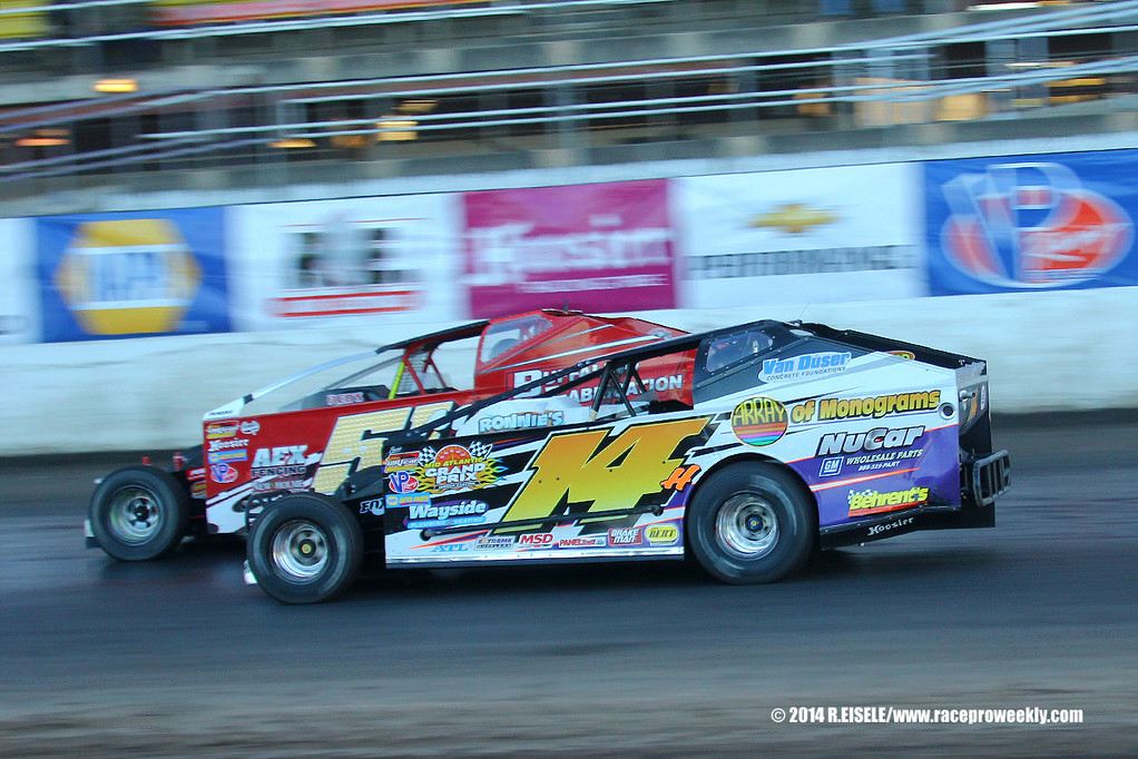 The Jeffer Jeff Heotzler races Dom Buffalino down the front stretch during the Syracuse 200